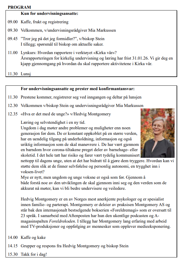 Vi har valgt å invitere prestene som jobber med konfirmanter på foredraget av Hedvig Montgomery, slik at flere kirkelige ansatte får høre henne. (Kun 40 ledige plasser for prestene) Samlingen med biskopen i starten på dagen er kun for undervisningsansatte.