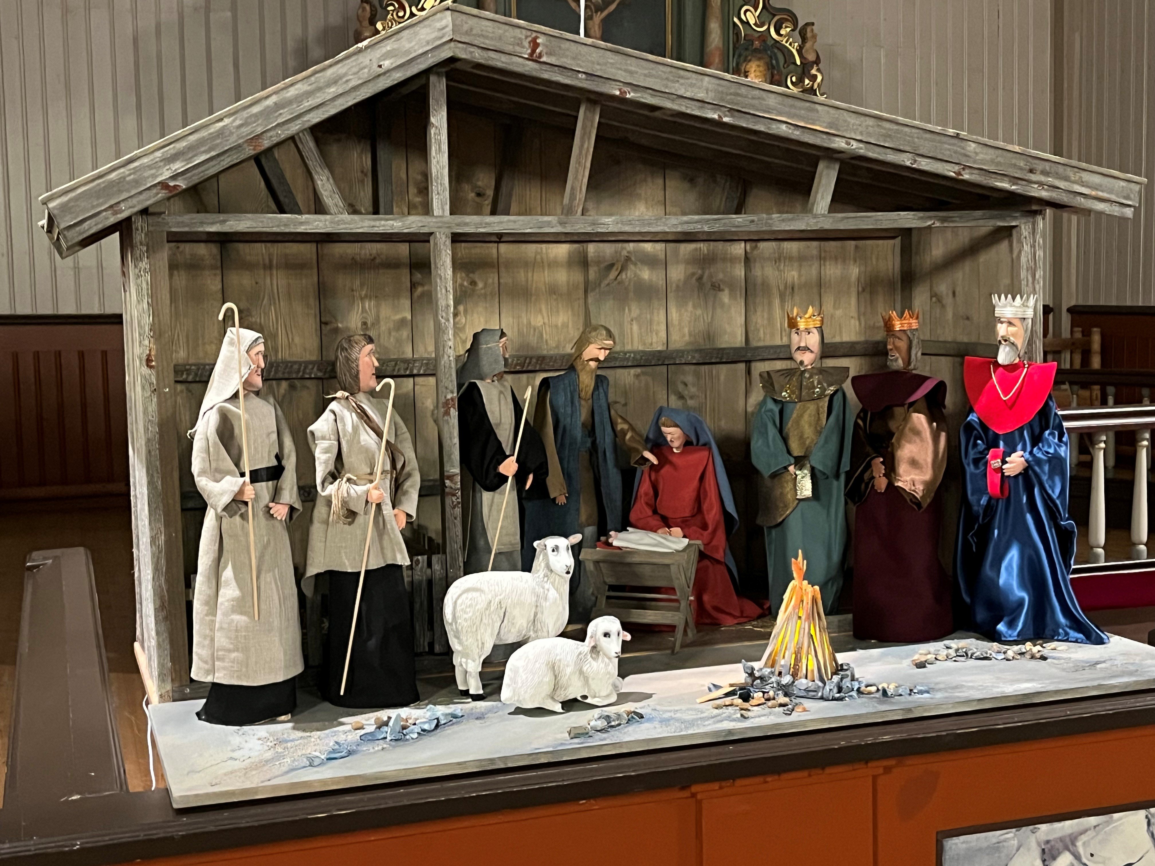 De tre vise menn ble plassert inn i den nye julekrybba helt til slutt, og så kunne sogneprest Jørgen Setran Indergård oppsummere den flokken som nå hadde kommet på på plass i Hegra kirks nye julekrybbe, som skal stå her til over jul og som skal pryde kirka i mange advents- og julefeiringer senere: