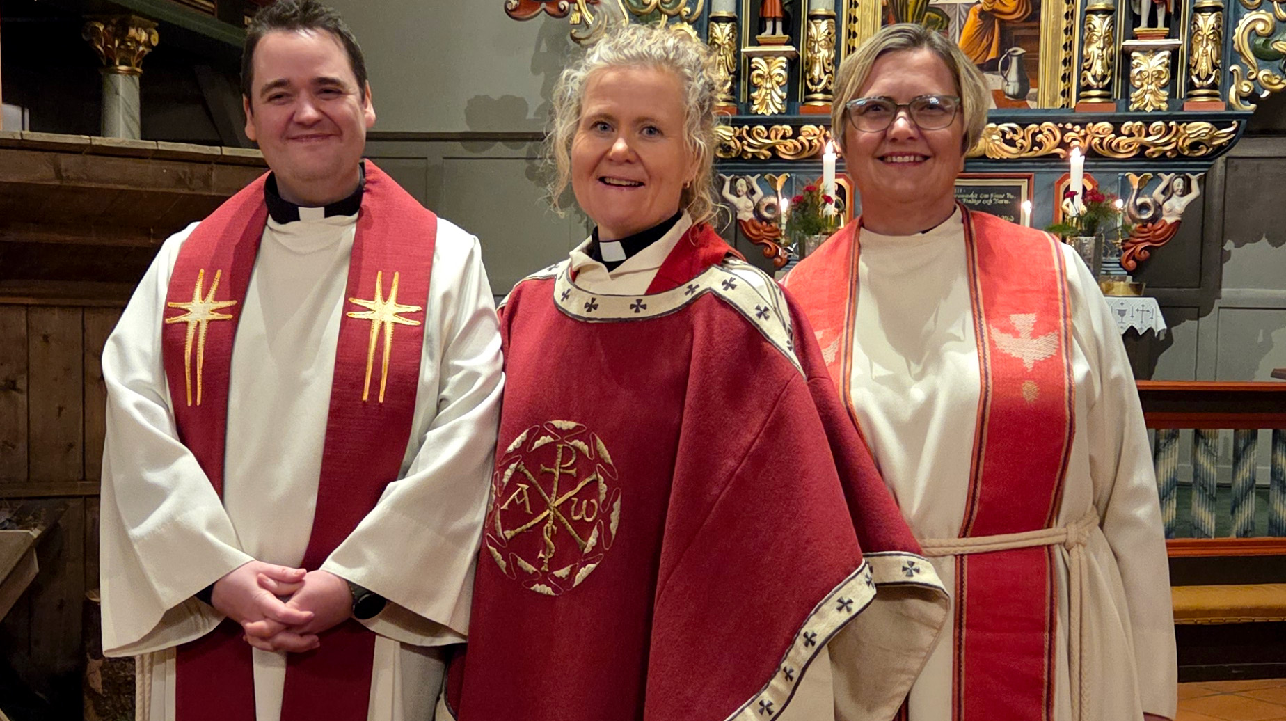 Sissel Muan, omkranset av prestekollegene Jonas Jensen Dahlberg og Åse Rugland