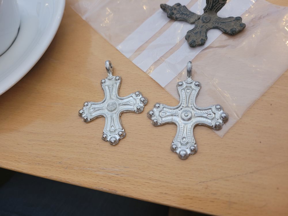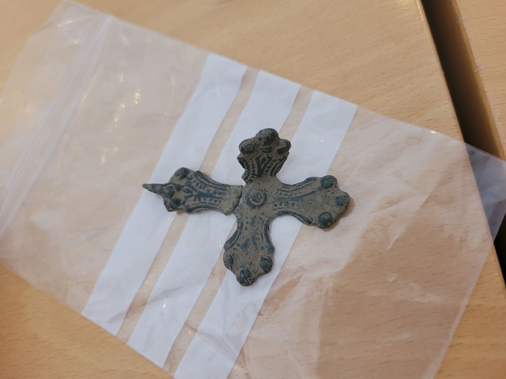 Espen Lundgjerdingen Mossevik er stadig ute med sin metalldetektor, og på en av sin turer fant han et kors - antakelig det eldste som er funnet på Toten. Dette er datert til mellom år 900 og 1000. Biskopen fikk se dette korset, og han fikk med seg en replika i tinn.