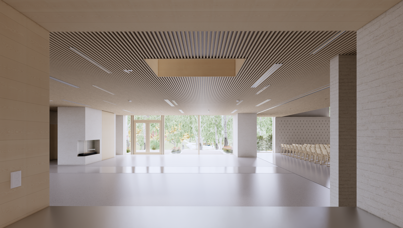 Aktivitetsrom i 2. etasje med vinduer ut mot kirkeparken. Her vil det være en skillevegg midt mellom de to vintuene som vil gjøre det mulig å skille av til to rom eller bruke det som et stort åpent rom. Her vil det spesielt bli tilrettelagt for barn og ungdom og mulighet for utleie til selskaper.