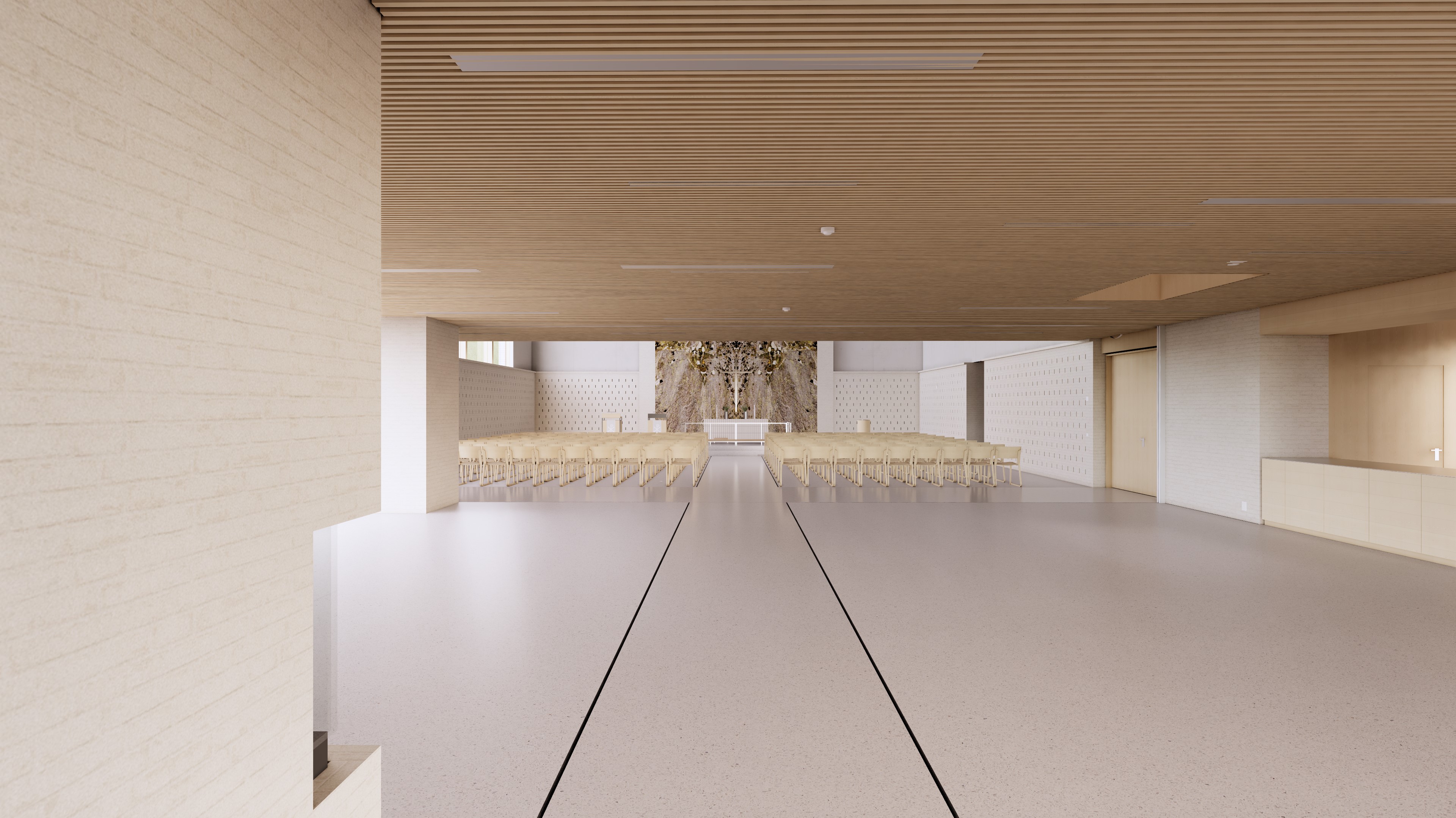 Dette bilde viser linjene fra kirkerommet og inn til kirketorget. Disse to rommene vil blir adskilt med en skillevegg slik at det blir mulighet for å bruke disse rommene som to rom, men også kunne åpne opp ved store gudstjenester eller seremonier. Det blir også et galleri som dere ser midt i bilde.