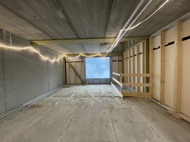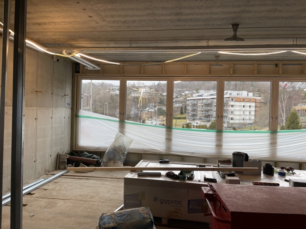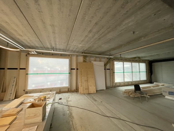 I fremre del av dette bilde vil det bli bygget et kjøkken til 2. etasje. I bakre del av bilde lages det et bandrom/grupperom. Her vil det bli utstyrt med instrumenter, men det vil også kunne bli brukt som grupperom ved behov.