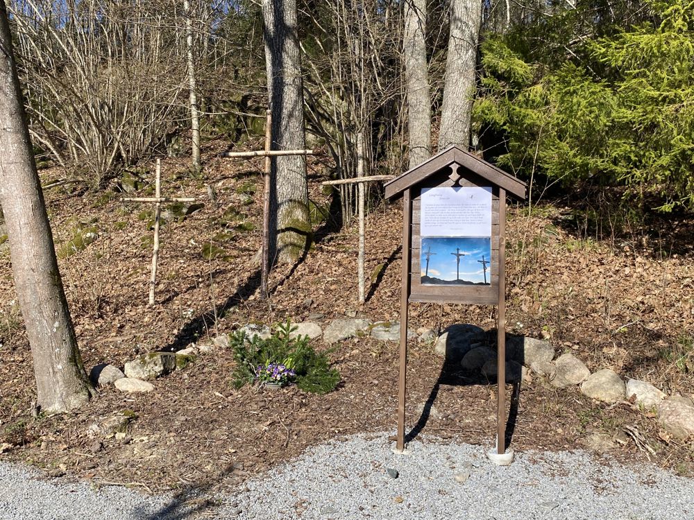 Det er en glede å kunne presentere påskens budskap gjennom en visuell sti. Med påskeukens innhold delt på flere oppslag langs stien er tanken å formidle påskens budskap gjennom bibelvers og bilder. Stien tar deg gjennom eikeskog. Det er opparbeidet sti i en meters bredde for enkel fremkommelighet. Langs stien er det plantet påskeliljer. Senere i mai vil stien være omkranset av blå og hvitveis.