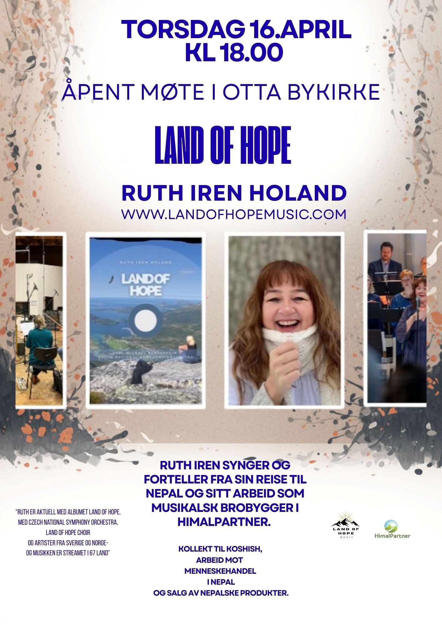 Torsdag 16. april kl. 18.00 kommer Ruth Iren Holand med Land of Hope til et åpent møte i Bykirka på Otta. Hun synger og forteller fra sin reise til Nepal og sitt arbeid som musikalsk brobygger i Himalpartner. Hjertelig velkommen!