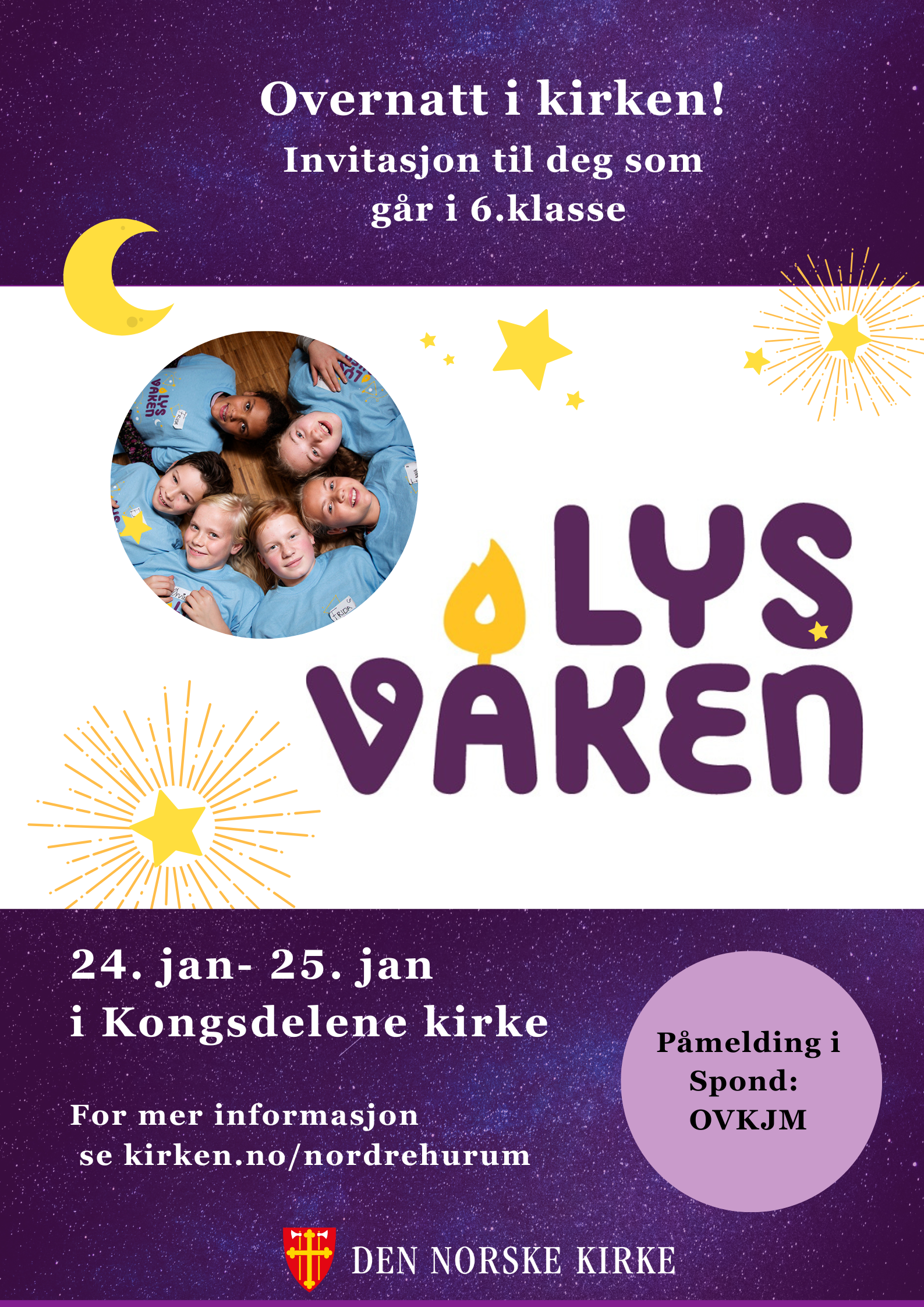 Plakat over: Overnatte i kirken! Lys våken - invitasjon til deg som går i 6. klasse. 24. januar til 25. januar i Kongsdelene kirke. Påmelding i Spond: OVKJM