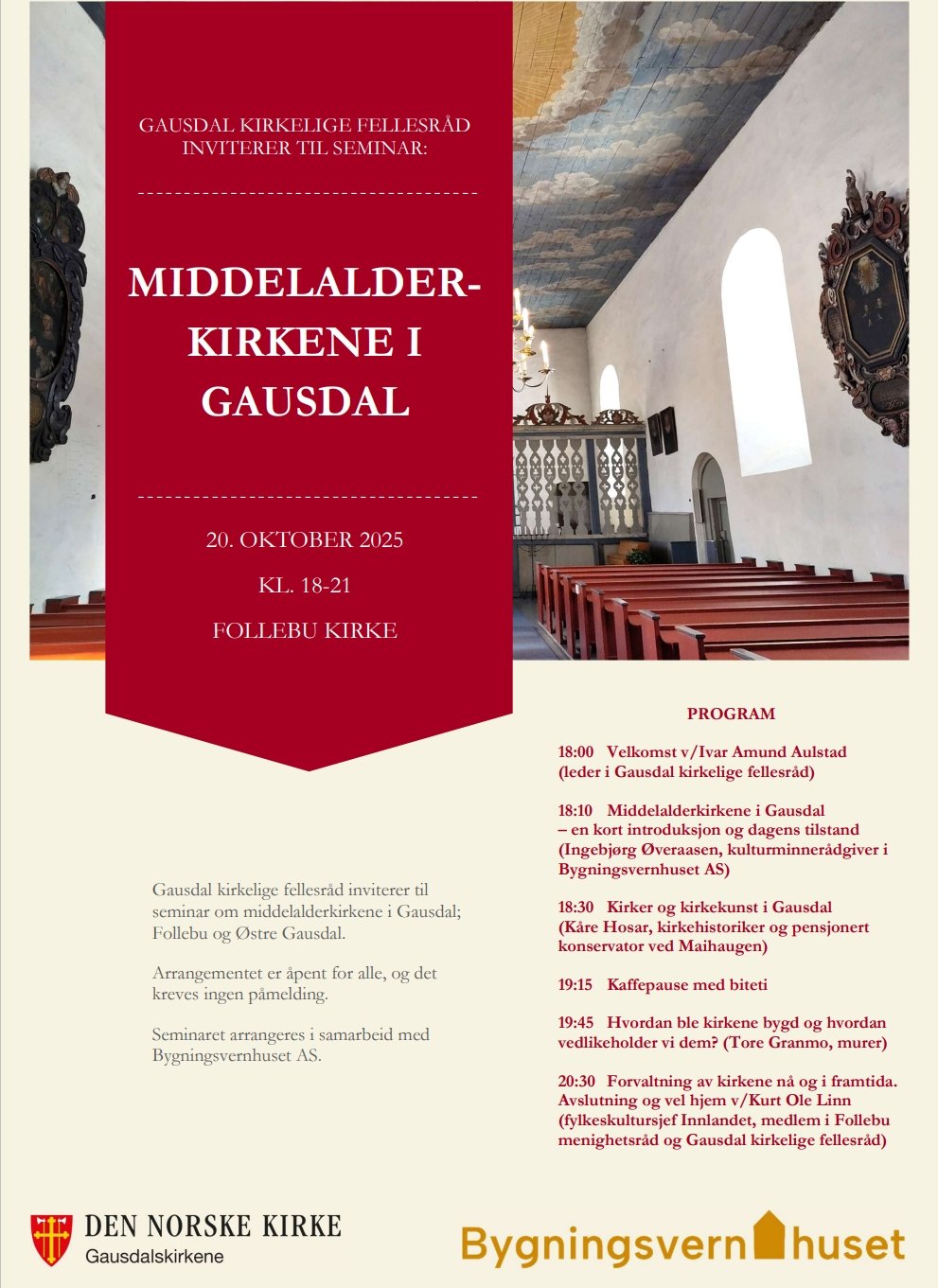 Åpent seminar i Follebu kirke 20. oktober kl. 18-21. Arr: Gausdal kirkelige fellesråd i samarbeid med Bygningsvernhuset AS.