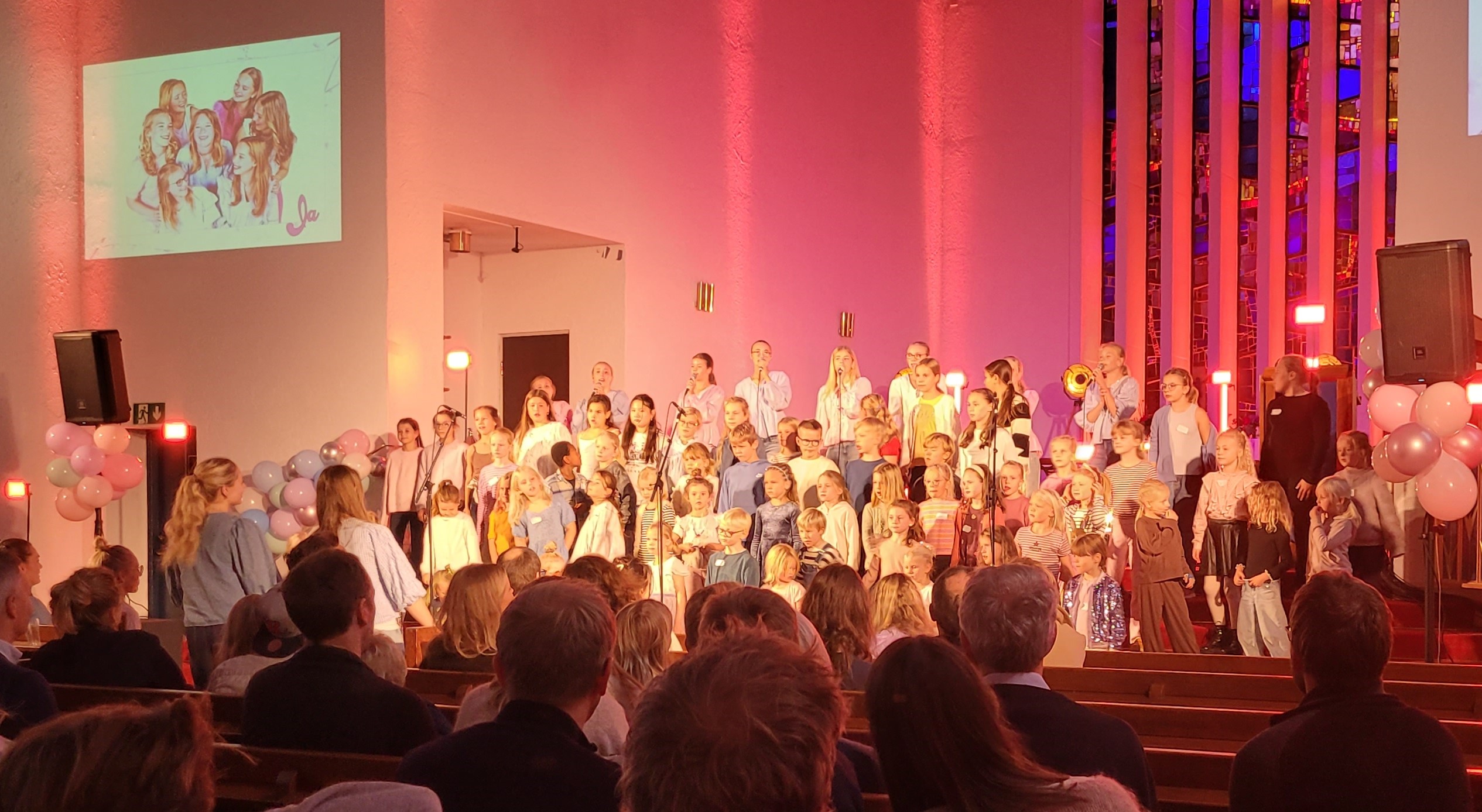 De har reist langt, mange av barna som fyller en kirke pyntet til fest. Skarpe strobelys og varme lamper i rødt og lilla får veggene til å skinne, og overalt henger ballonger i metallisk rosapastell. Kirkerommet minner mest av alt om prinsessedisko, godt hjulpet av over 70 sangere i barneskolealder.