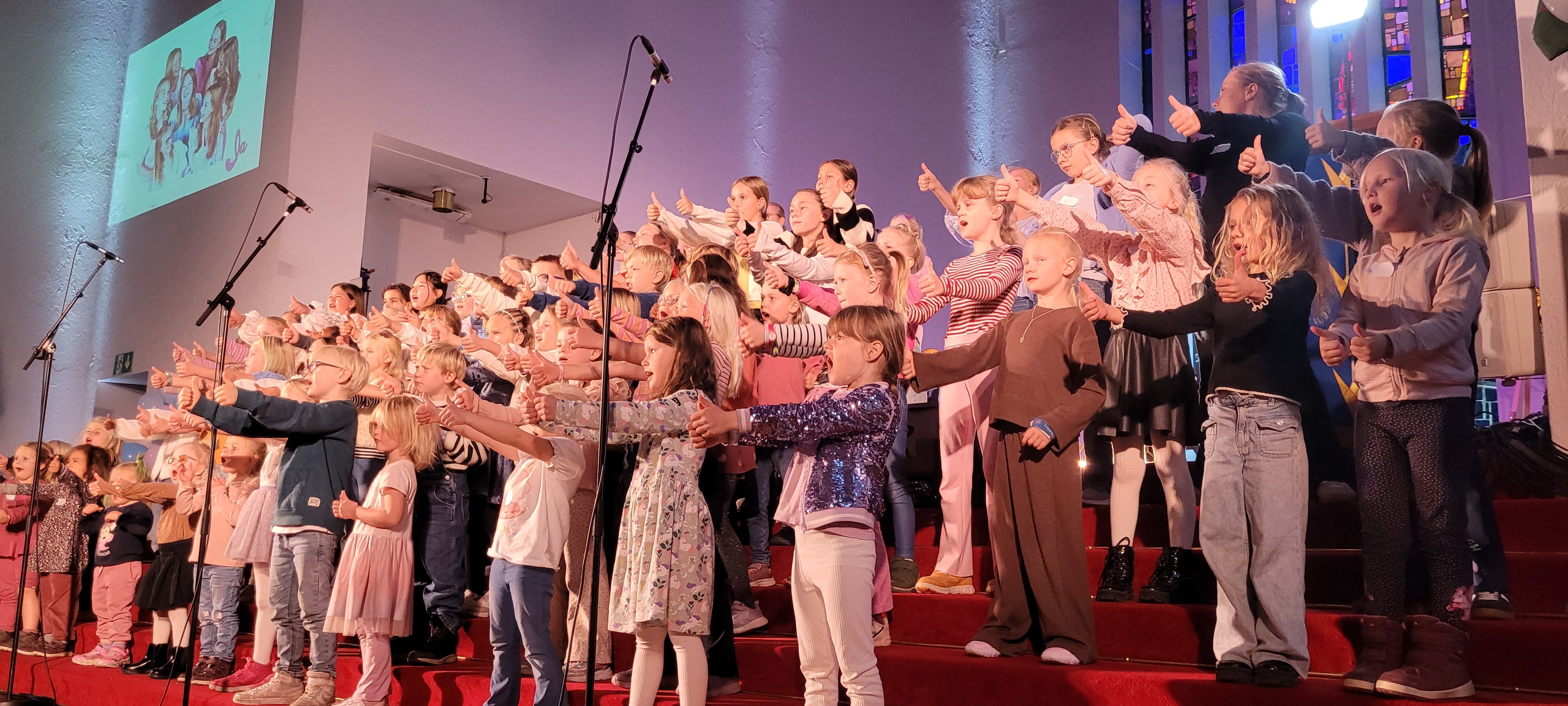 70 barn som synger av full hals, er rørende og sterkt. Innøvde dansetrinn går plutselig på automatikk, og 70 par små hender peker mot himmelen mens lyse stemmer synger om Gud og glede. I publikum tørkes det tårer allerede fra første tone.