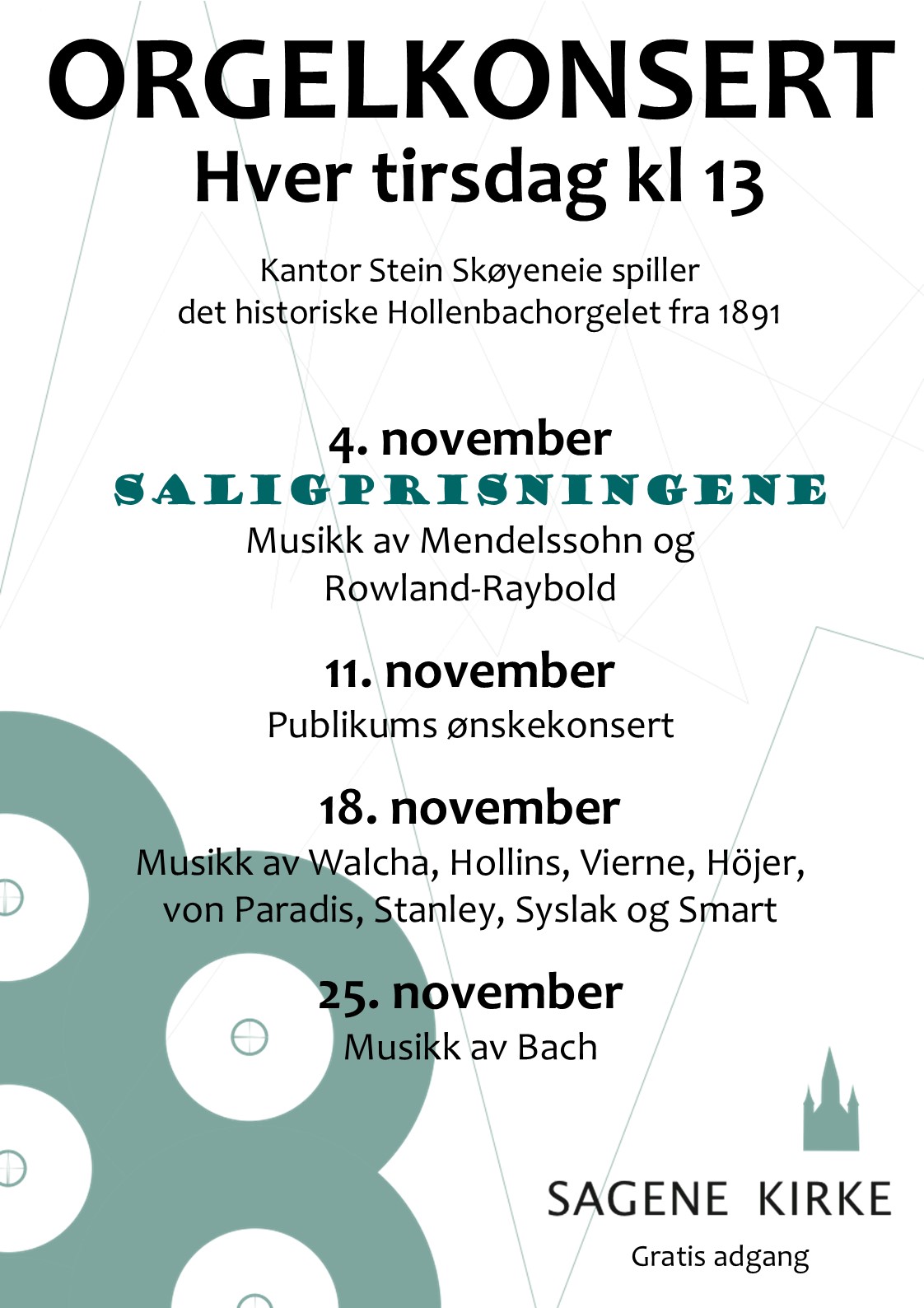 Hver tirsdag kl 13 (unntatt juli og august) spiller kantor Stein Skøyeneie en orgelkonsert på det historiske Hollenbach-orgelet i Sagene kirke. Konserten er gratis, og kan kombineres med en påfølgende kort tidebønn. Her finner du månedens program. Velkommen!