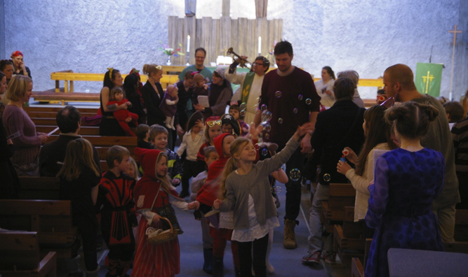 Vi feirer gudstjeneste søndag klokken 11. Alle er hjertelig velkomne. Gjennom et semester er det mange ulike grupper som er med å lage gudstjenester.