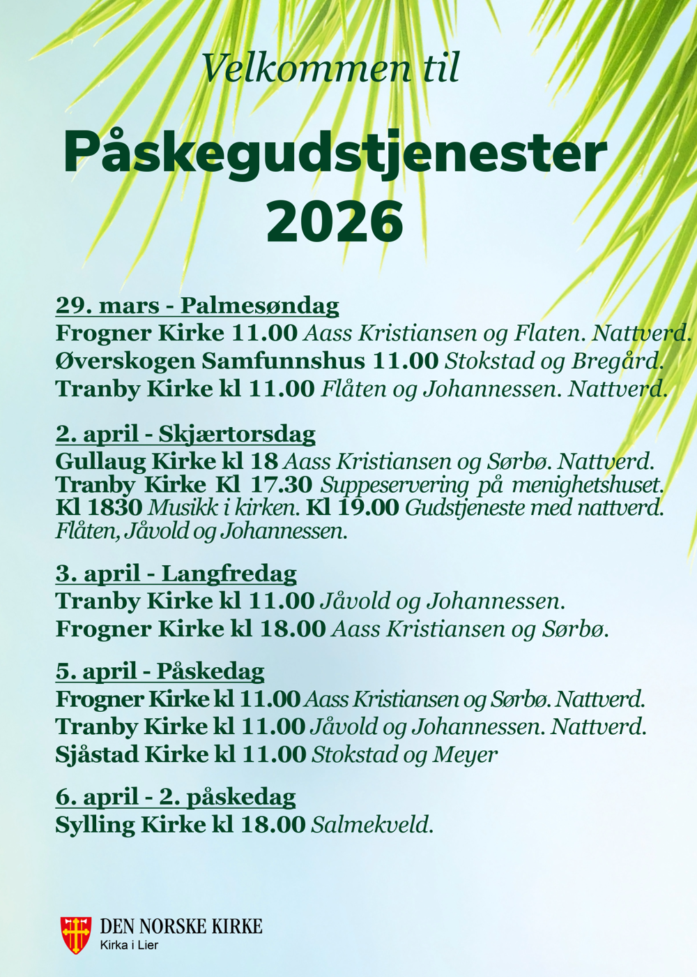 Frogner Kirke kl 11.00 Aass Kristiansen og Sørbø. Nattverd.
