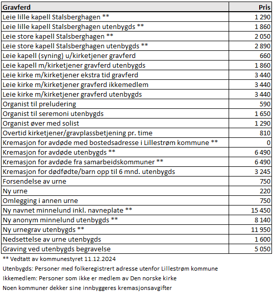 De helt grunnleggende tjenester fra gravferdfsmyndigheten er gratis for avdøde med bostedsadresse i Lillestrøm kommune. Dette gjelder selv om avdøde på grunn av sykdom eller alderdom har bodd i en annen kommune mot slutten av livet.