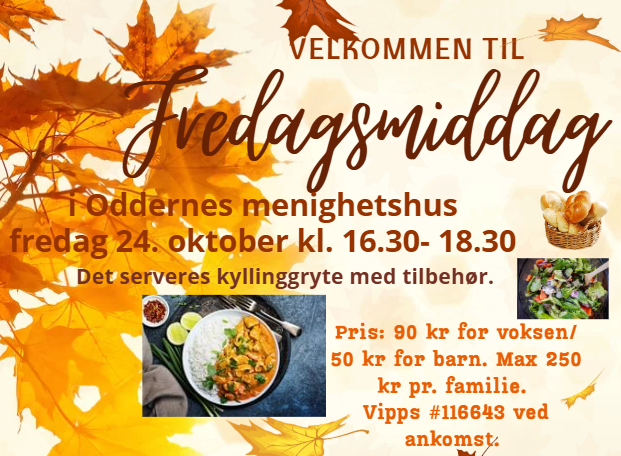 Velkommen til ny fredagsmiddag. Vi serverer kyllinggryte med tilbehør fredag 24. oktober.