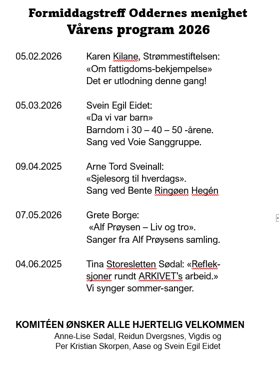 FORMIDDAGSTREFF er å være sammen, å kunne sitte ned med andre, få inspirerende ord, noe for tanken, noe for hjertet og musikk for øret og hjertet. Det er å be og synge sammen. Fremmøtet er vanligvis ca. 70 personer. Vi håper Formiddags-treff er noe for deg!