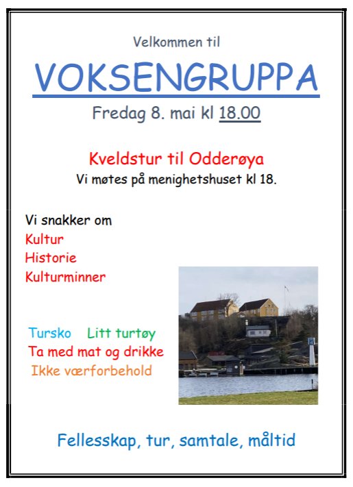 Fredag 8. mai går voksengruppa på kveldstur til Odderøya. Vi møtes på meighetshuset kl. 18, kledd etter været. Velkommen!