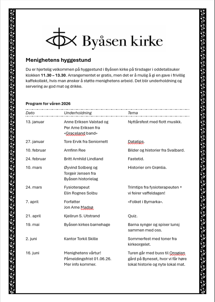 Programmet for våren 2026 er klart, og vi starter opp med nyttårsfest tirsdag 13. januar klokken 11.30 - 13.30. Anne Eriksen Valstad og Per Arne Eriksen fra "Graceland band" kommer og gleder oss med flott musikk! Vi skal også kose oss med god mat og drikke i hyggelig lag. Ta gjerne med deg en nabo eller venn. Kom og opplev det gode fellesskapet vårt!