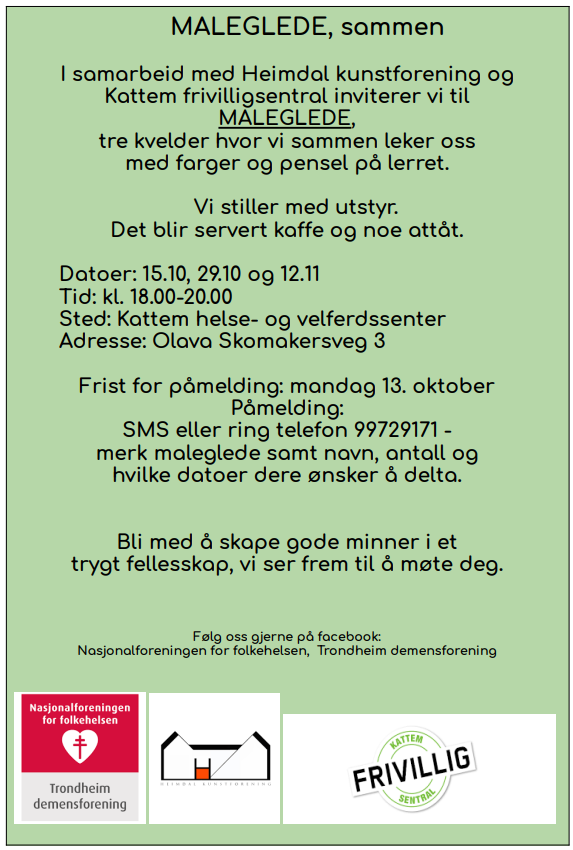 Trondheim demensforening i samarbeid med Heimdal kunstforening og Kattem frivilligsentral inviterer demensrammede og deres pårørende til arrangementet MALEGLEDE som holdes ved Kattem helse- og velferdssenter 15. oktober, 29. oktober og 12. november kl. 18-20. Påmeldingsfrist 13. oktober. Se mer informasjon under les mer.