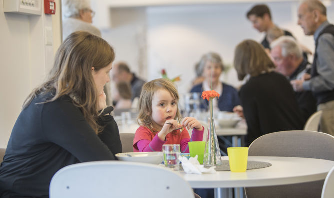 En uformell møteplass i Sverresborg Kirkesenter. En torsdag i måneden samles vi til felles middag og aktiviteter for alle generasjoner!