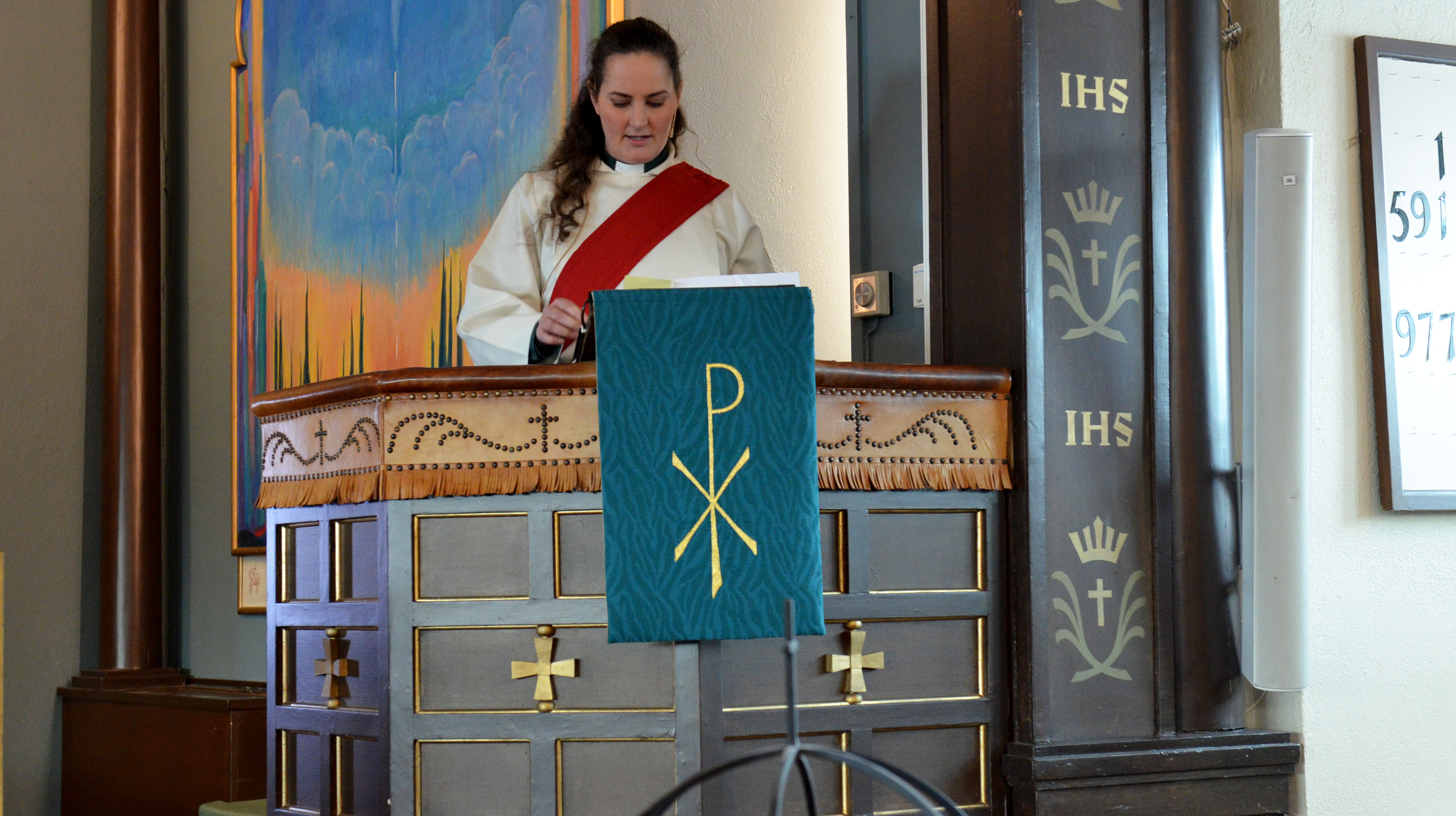 Den røde skråstolaen over skulderen viser med all tydelighet at Marie Sætherskar Hauge nå er vigslet kateket i Den norske kirke.