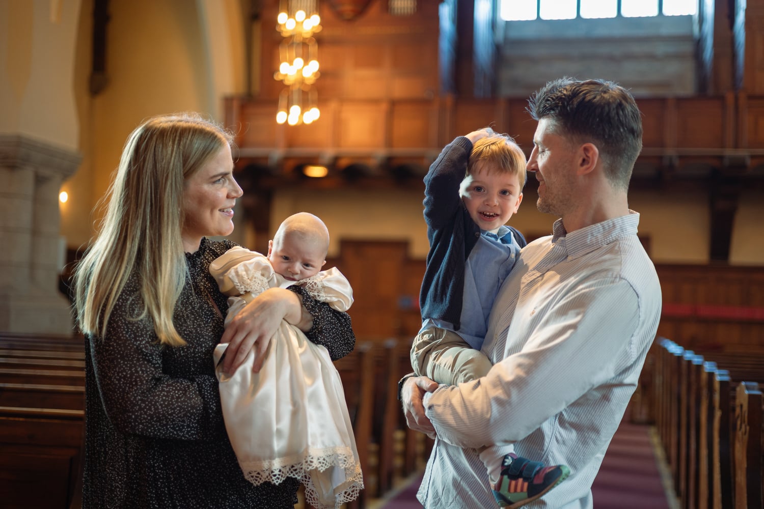 Lille Magnus (2 mnd) skal prøve dåpskjolen. Storebror Fredrik (snart 2 år) utforsker døpefonten sammen med pappa.