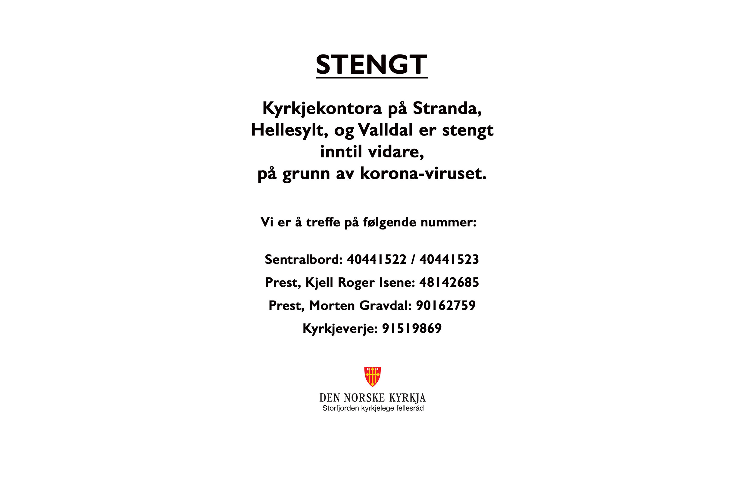 Kyrkjekontora i Storfjorden kyrkjelege fellesråd er stengt.