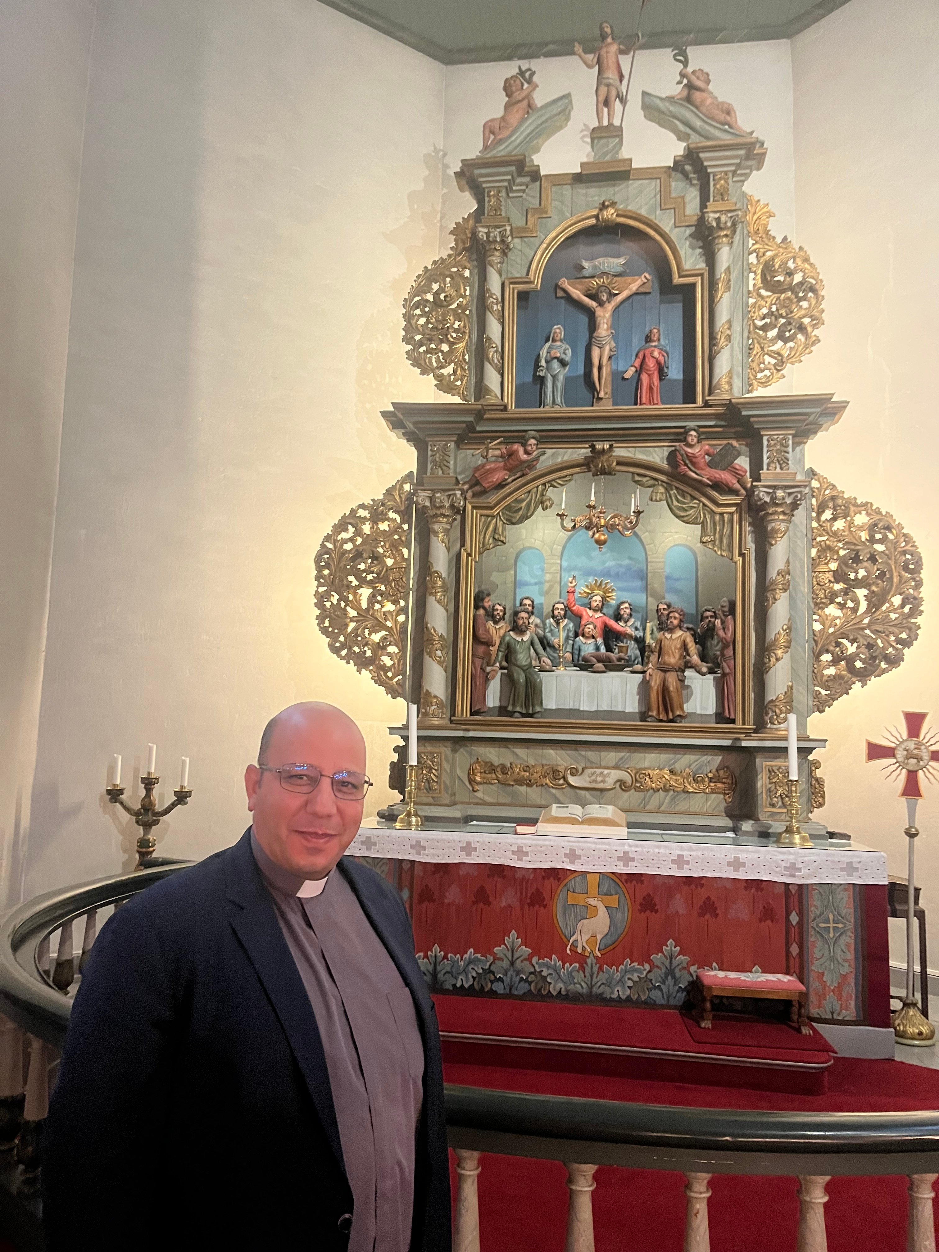Pastor Imad Haddad er prest i Den lutherske menigheten i Amman. Han er valgt til ny biskop i Den evangelisk-lutherske kirke i Jordan og Det hellige land og vil bli innsatt i januar neste år. Under sitt besøk til Oslo bispedømme, under Fredsuka for fred og rettferdighet i Israel og Palestina, besøkte han Asker kirke. Der møtte han menighetsrådets leder Marianne Uri Øverland og Atle Sommerfeldt og Karoline Astrup fra menighetens komite for vennskapsrelasjonen med den lutherske menigheten i Beit Jala.