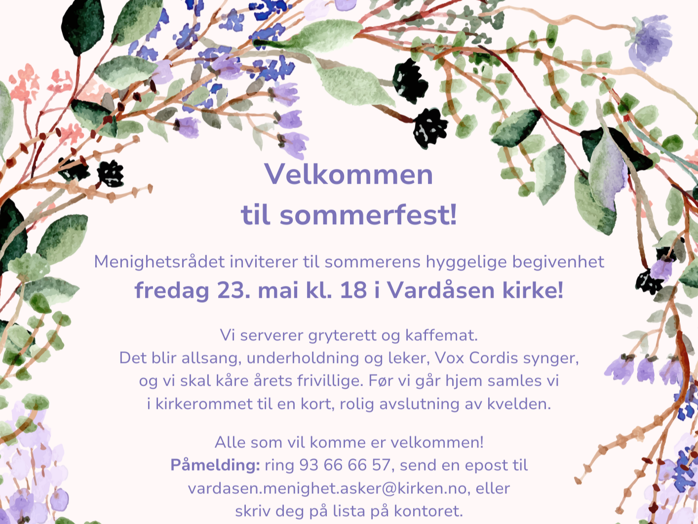 Fredag 23. mai inviterer vi til sommerfest i Vardåsen menighet