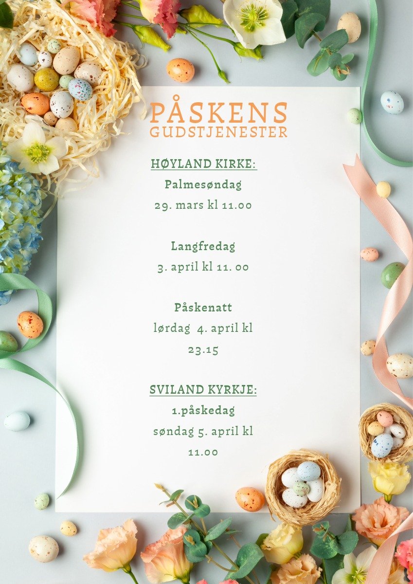 Vi har felles gudstjenester med Hana menighet på Skjærtorsdag og Langfredag. På Skjærtorsdag feirer vi gudstjeneste sammen i Hana kirke kl 19.00, på Langfredag er det gudstjeneste kl 11.00 i Høyland kirke med lesing av lidelseshistorien, solosang av Patrik Kristoffersen og fløytespill av Tim Martin Norrud.