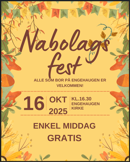 Velkommen til nabolagsfest i Engehaugen kirke 16.10.2025 kl 16.30