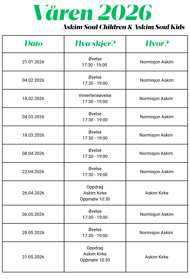 Øvelsene er på Normisjon i Askim kl. 17.30 - 19.00. Et kor for 1.-7-klasse. Er dere nysgjerrige, så stikk innom en tur for å sjekke ut. Ta gjerne med en venn.