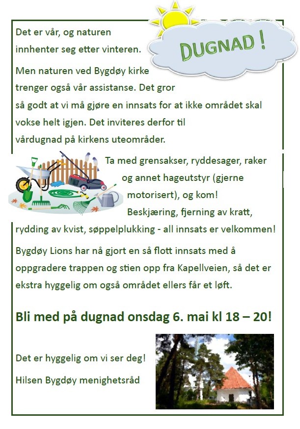 Dugnad på kirkens uteområder 6.mai kl. 18 - 20.