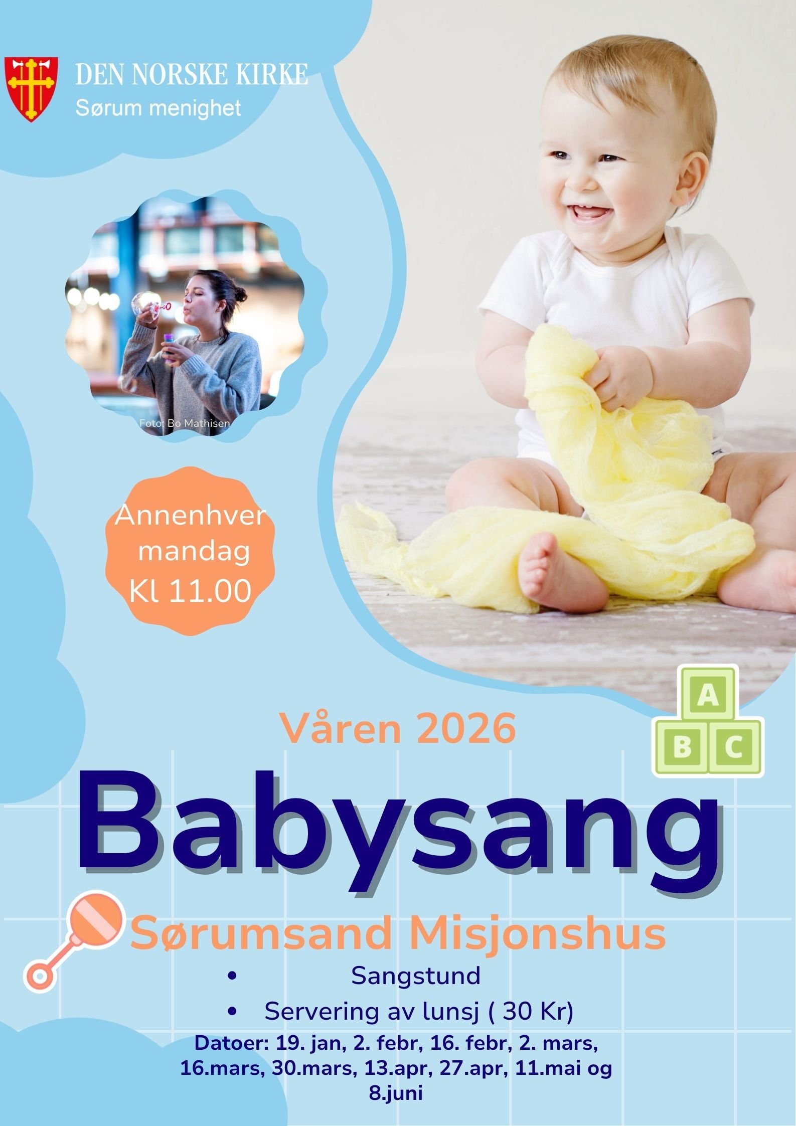 Babysang på Sørumsand Misjonshus er et åpent tilbud for alle babyer fra 0-12mnd i følge med en voksen. Dette tilbudet er felles for Sørum og Blaker menigheter.