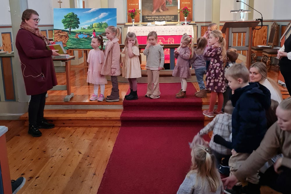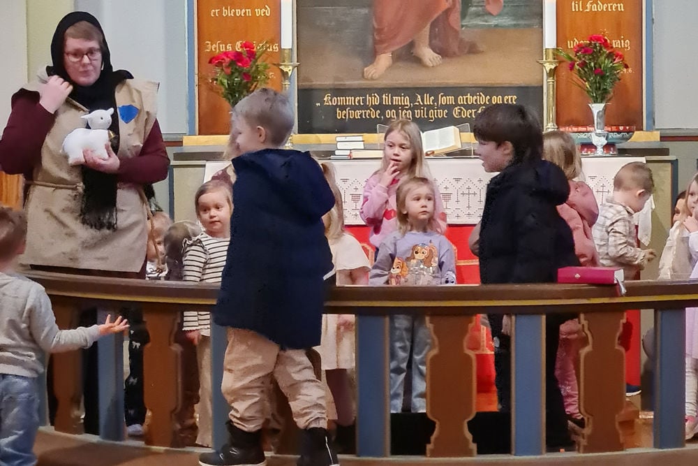 På gudstenesta fekk vi besøk av ein gjetar. Han hadde med seg heile saueflokken! Og då den eine sauen, Krølle, hadde rota seg bort, var alle med på å leite. Ei lang rekke av barn var på leiting gjennom heile kyrkja; under benkar, oppå preikestolen, nedi leikekroken og bak alteret. Heldigvis fant vi sauen til slutt! Han hadde gøymd seg under knelekrakken i alterringen.