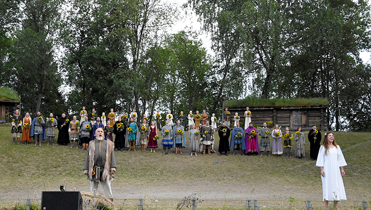 «Makter gode, dei kan vende alt det onde. Til det gode, slik som dette kongeblodet!» Fra finalescenen i årets Stiklestadspel. Gamal-Jostein (Even Stormoen) og Gudrun (Hanne Skille Reitan) foran noen av skuespillerne i oppsetningen.