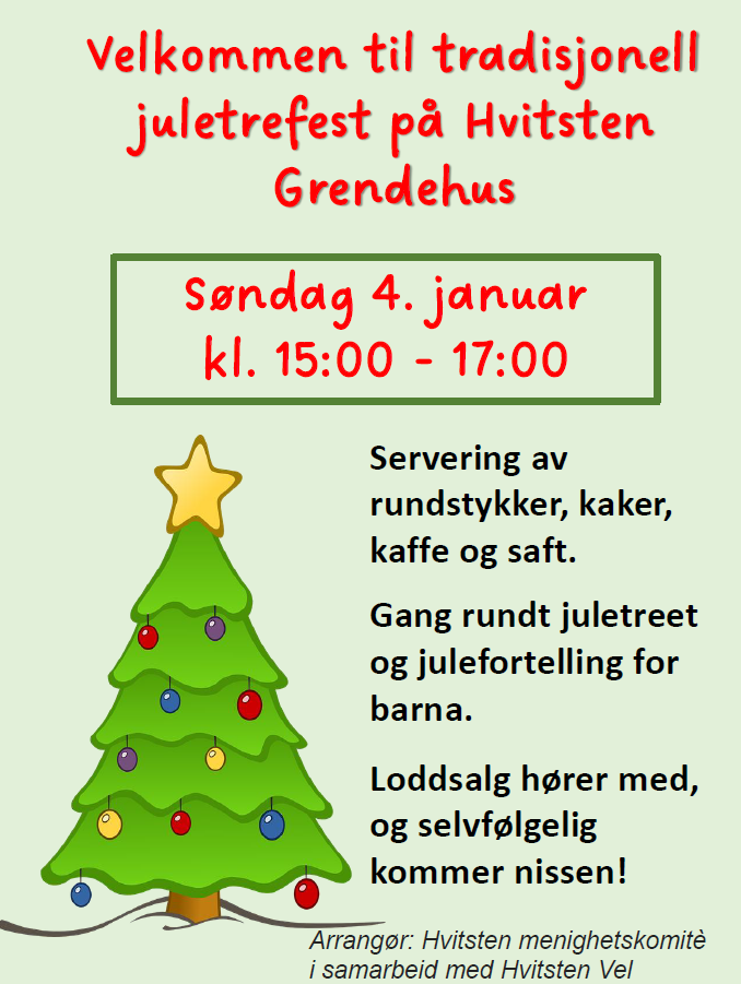 Hvitsten menighetskomité og Hvitsten Vel ønsker velkommen til juletrefest på grendehuset, søndag 4. januar, kl.15-17. Velkommen!
